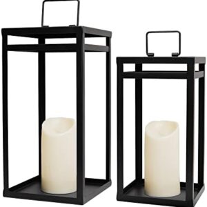 HPC Decor Black Metal Candle Lanterns Set of 2- Lanterns Decorative w/ LED Timer Candles- 15.8” & 12.6” Chunky Modern Farmhouse Lantern Decor for Indoor,Outdoor,Fireplace,Porch (No Glass)