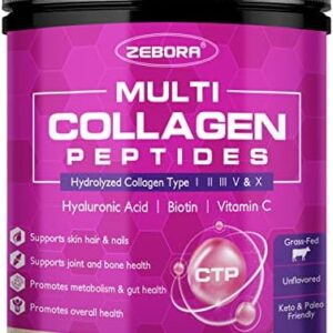 ZEBORA Multi Collagen Peptides Powder – Hydrolyzed Collagen Type I II III V X with Hyaluronic Acid, Biotin, Vitamin C – Support Skin Hair Nail Joints, Non-GMO, Unflavored, Keto Friendly