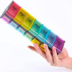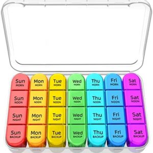 Zoksi Weekly Pill Organizer 4 Times a Day, 7 Day Pill Box, Large Travel Pill Case, Daily Medicine Organizer Container with 28 Portable Compartments for Fish Oils, Vitamins or Supplements (Rainbow)