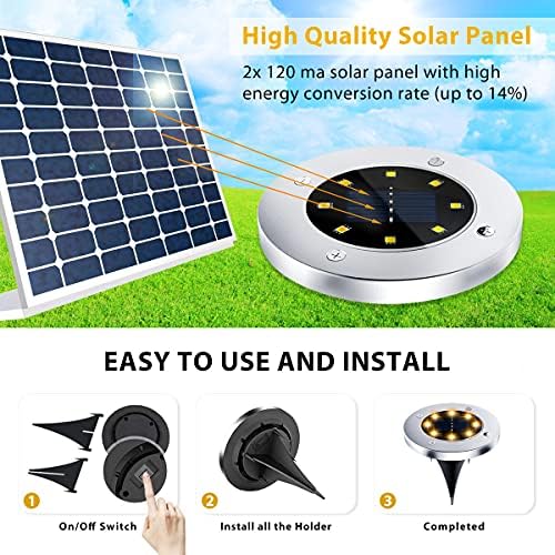 Bright Solar Path Lights: Unlike other’s 6 leds, our solar ground lights consist of 8LED lights which means producing more light for your path,600 mAh Ni-MH battery.These Solar lights automatically turn on in darkness or at night and turn off in daytime or bright area.It can illuminate for 6-8 hours within full day charging.(Charging and working time will change depending on the weather)