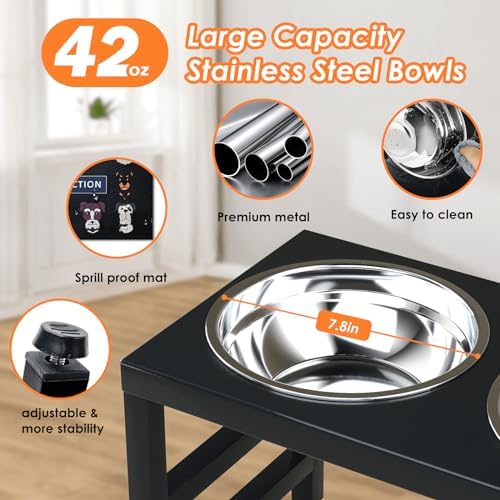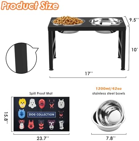 【EASY TO SET-UP】- Taking only 2 minute to assemble, the dog bowl set includes two food-grade stainless steel dog bowls (1200ML), a splash proof mat (12×19 inches), and other assembly accessories.