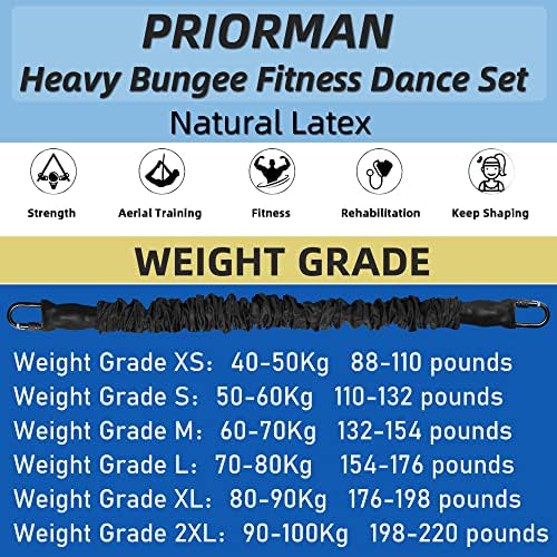 Six Sizes Available for Your Selection: Our bungee cord exercise equipment offers multiple weight grades. XS: 88 – 110 pounds, S: 110 – 132 pounds, M: 132 – 154 pounds, L: 154 – 176 pounds, XL: 176 – 198 pounds, and XXL: 198 – 220 pounds. Moreover, this bungee fitness equipment is suitable for floors with heights ranging from 2.5m – 3.8m (8.2ft – 12.5ft).