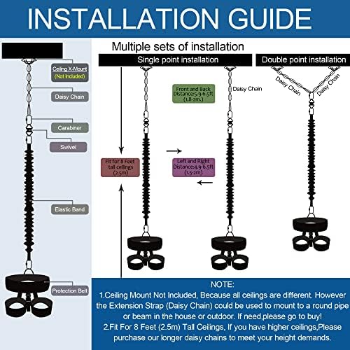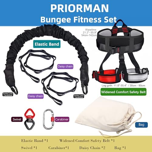 What You Will Receive: The bungee resistance band kit includes:1 * Elastic bungee rope (3.7ft),1 * Adjustable bungee fitness harness (an adjustable, padded harness around the waist and thigh, providing maximum comfort for exercisers),3 * Carabiners (2 are already installed, with an additional one),1 * Swivel (a rotational device that can rotate 360°),2 * Daisy chains (3.6ft),1 * Carry bag,1 * Installation instructions.