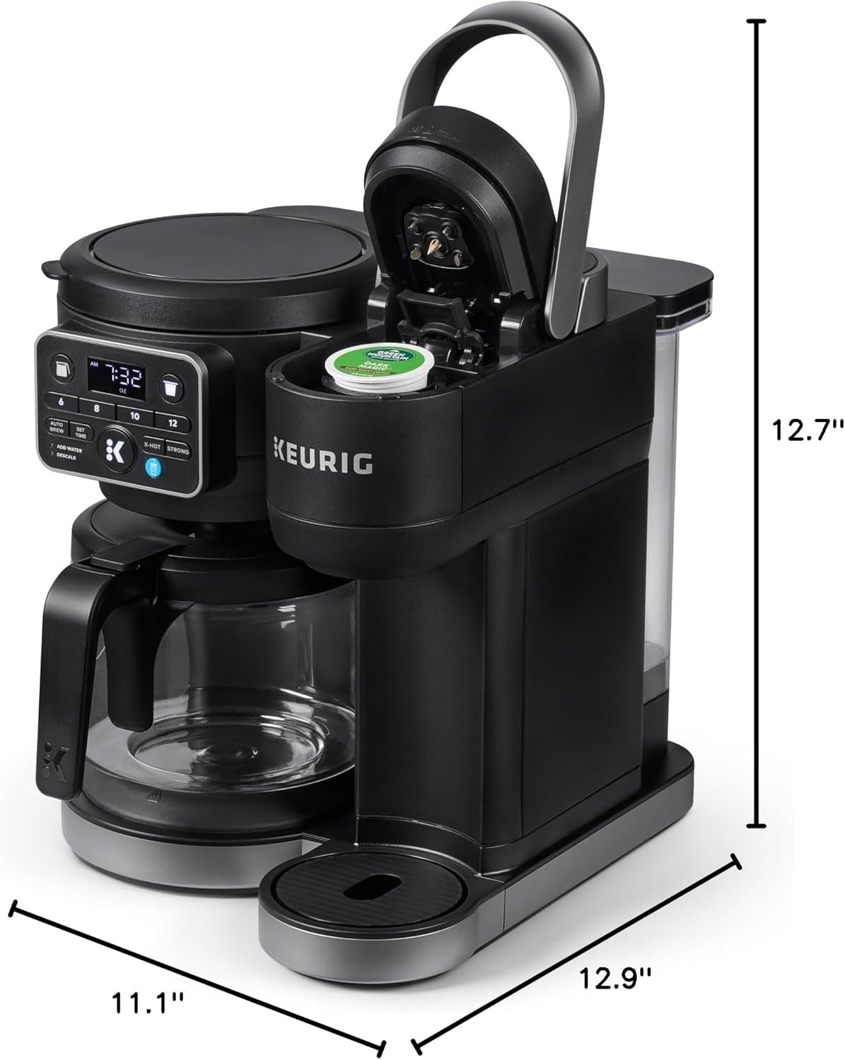 Meet the improved Keurig K-Duo Single Serve & Carafe Coffee Maker: the brewer made for every moment. It gives you the flexibility to brew delicious coffee in single cups using K-Cup pods OR in full carafes using your favorite grounds — so you can serve yourself or a crowd, all with one compact unit. It features an extra-large, 72oz removable water reservoir that feeds both sides of the brewer, which means easier brewing with fewer refills. Plus, a convenient new front-facing control panel with digital readout lets you quickly and easily select your brewing preferences. The single cup side brews all your favorite K-Cup pods in 6, 8, 10, or 12oz sizes. The K-Duo with MultiStream Technology saturates the grounds evenly to extract full flavor and aroma in every cup, hot or cold. It offers a variety of brewing options to craft your ideal cup, now including Brew Over Ice for making refreshing iced coffees and teas, as well as Strong Brew for brewing a bolder, more intense cup and the Extra Hot feature for an exceptionally steamy cup. The carafe side brews in 6, 8, 10, and 12-cup sizes, and with programmable Auto Brew you can set your preferred brew time up to 24 hours in advance. It features a newly designed glass carafe that minimizes dripping and a heating plate for keeping your coffee hot and delicious from the first cup to the last. Whether you’re enjoying a cup for yourself or hosting a crowd … looking for cool refreshment or cozy warmth … the Keurig K-Duo is the one brewer that’s made for every moment.*Cup not included*
