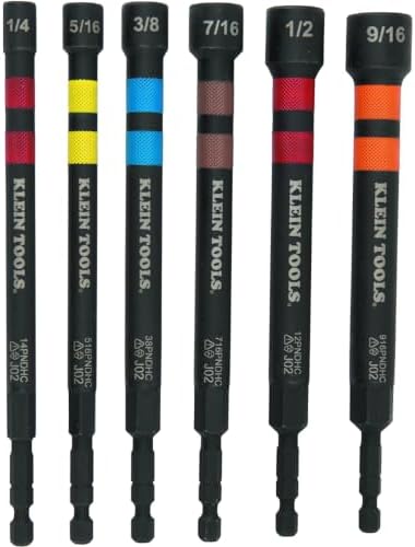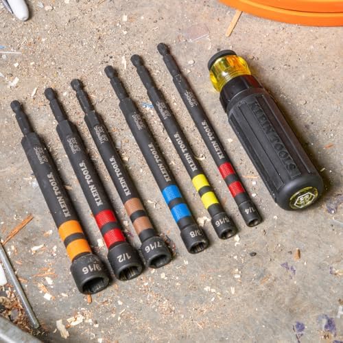 Klein Tools 32950 Ratcheting Impact Rated Hollow Power Nut Driver Set with Handle, Magnetic, Color Coded, 6 SAE Hex Sizes