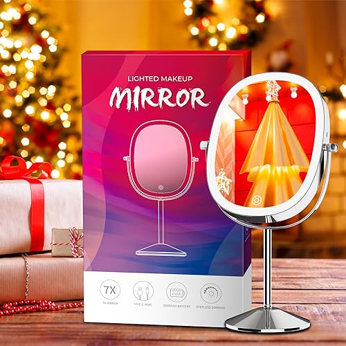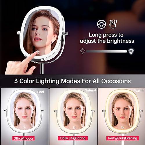 【1X/7X Magnifying Mirror HD】:This double-sided led mirror makeup makes it easier to get the perfect makeup look, 1X for daily use and hair styling, 7X magnifying mirror for detailed makeup, contact lens wear, skin care, shaving and applying mascara. Enjoy detailed makeup and skin care! Warm tips: when using the 7X magnifying makeup mirror, please keep your face 4 inches away from the mirror to avoid dizziness.