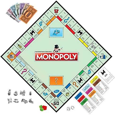 Buy, sell, dream, and scheme the way to riches with the Monopoly board game! Select a favorite Monopoly token, place it on Go, and roll the dice to own it all! Featuring classic Monopoly gameplay, this favorite family board game is all about buying, selling, and trading properties to win. Chance or Community cards can be a game changer. They can make a player richer–or send someone to Jail! Looking for games for Fam-ily Game Night? The Monopoly game is a Family Game Night staple. It’s a fun indoor activity for kids ages 8 and up and a great family gift. The Hasbro Gaming and Monopoly names and logos, the distinctive design of the gameboard, the four corner squares, the Mr. Monopoly name and character, as well as each of the distinctive elements of the board and playing pieces are trademarks of Hasbro.