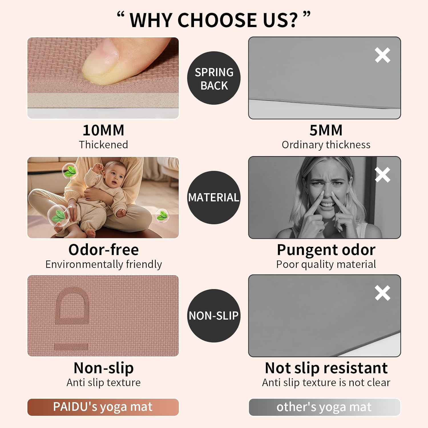 HIGH QUALITY MATERIALS:Paidu yoga mat made from premium quality POE material, this material is the latest technological improvement to the traditional yoga mats. No latex, no PVC, or any heavy metal.This exercise mat for home workout is flexible, tear-resistant,and designed for long-lasting.durability.
