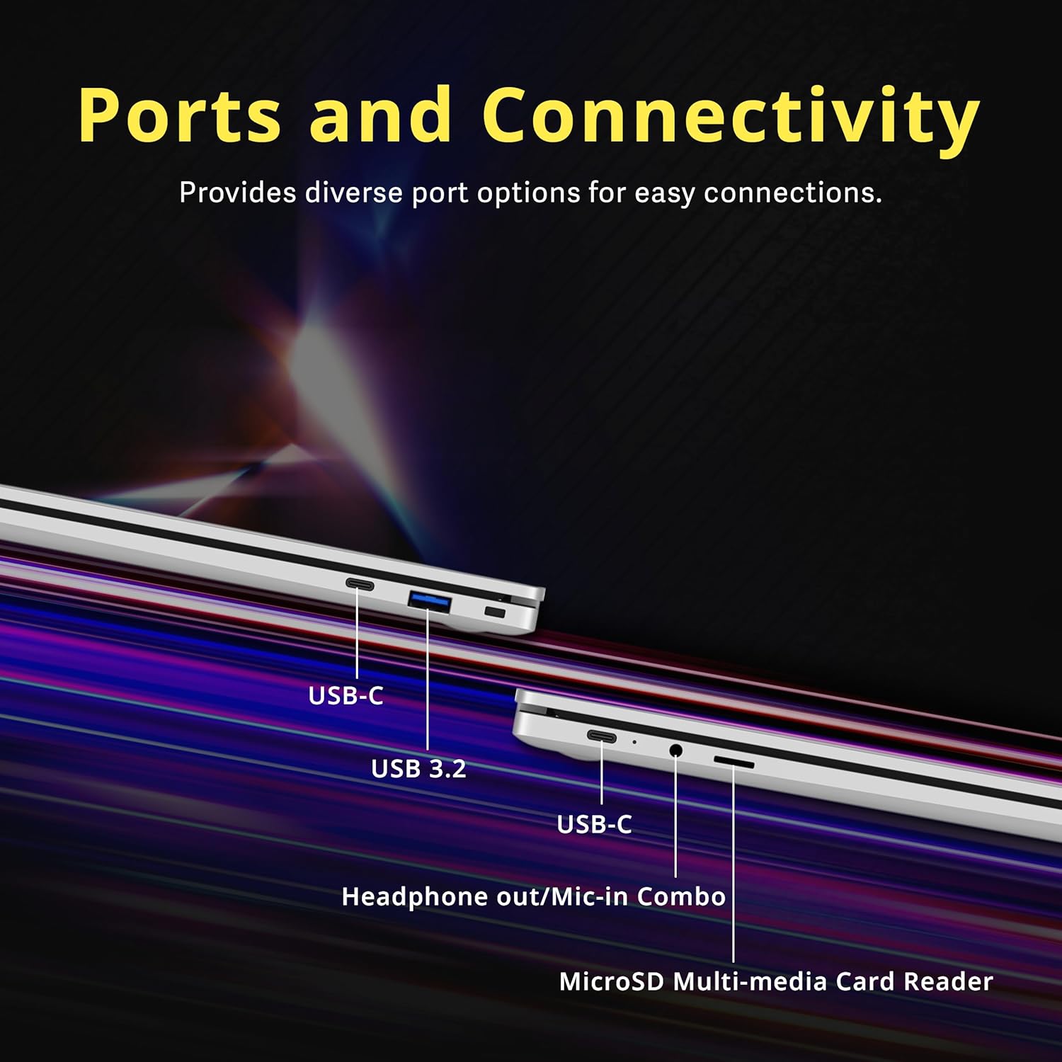 【Chrome OS】12.88 x 8.88 x 0.63, 3.2 lbs.【Ports】1 x USB-A 3.2, 2 x USB-C, 1 x Headphone Jack. Wi-Fi 6.【Bonus Docking Station Set】1x 7-in-1 Docking Station with 128GB Storage, 1x 32GB MicroSD Card with Adapter, 1x Type-C Data Cable, 1x 3-in-1 Charging Cable, 1x Suede Cleaning Cloth.