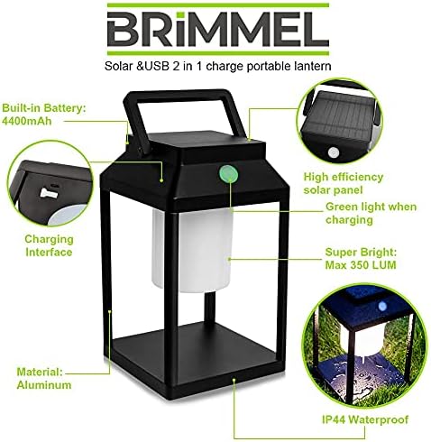Dimensions: L: 5.9″/ W: 5.9″/ H: 9.8″ Meterial: Aluminum Luminous Flux: 40 lumen/ 240 lumen/ 350 lumen Color Temperature: Warm white (3000K) Built-in Li-ion Battery Solar & USB charge 2 in 1