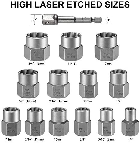 13+1 pieces 3/8 inch drive bolt remover set includes 3/4″(19mm), 11/16″, 17mm, 5/8″(16mm), 9/16″(14mm), 13mm, 1/2″, 12mm, 7/16″(11mm), 10mm, 3/8″, 5/16″(8mm), 1/4″, and hex adapter.