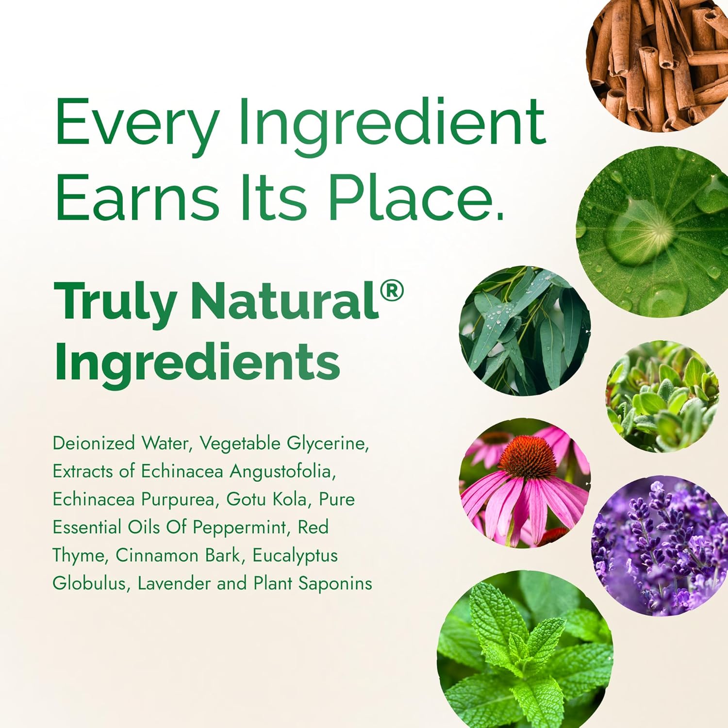 INGREDIENTS – Deionized water, vegetable glycerine, extracts of echinacea angustofolia, echinacea purpurea, gotu kola, pure essential oils of peppermint, red thyme, cinnamon bark, eucalyptus globulus, lavender and plant saponins.