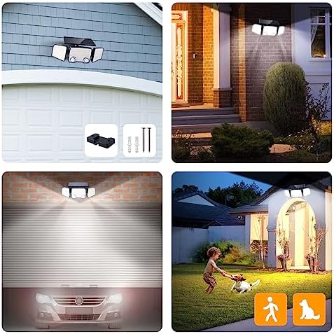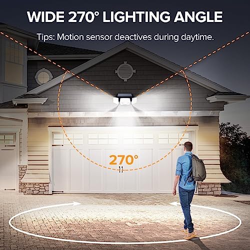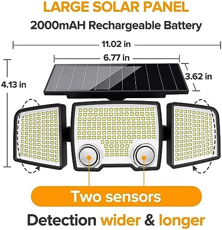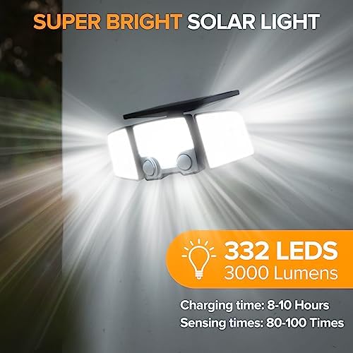 【332 Ultra-Bright LED & Wide Angle Illumination】With 332 ultra-bright LED, the solar flood light emits a powerful 3000 lumen warm white light (7000K color temperature). The three adjustable heads ensure flexible angle adjustments, ensuring a wide coverage of up to 270 degrees, effectively illuminating larger outdoor spaces.