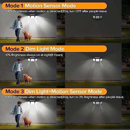【3 Lighting Modes & Wide Applications】 The solar light offers three versatile lighting modes: ① Motion-activated 100% brightness at night; ② Always-on 10% brightness at night for 8 hours ; ③ Always-on 3% brightness at night with motion-activated 100% brightness. These modes satisfy various usage requirements, making it suitable for outside use in garage,yard, porch, and swimming pools, etc.