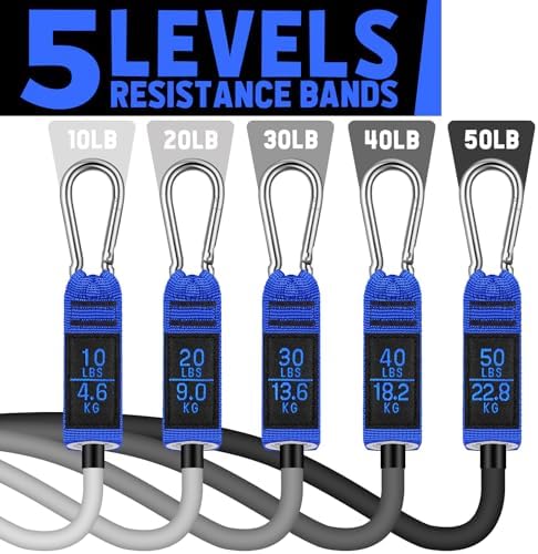 5 Level Exercise Bands Set: Walito resistance bands set come with 5 different resistance levels: 10lbs, 20lbs, 30lbs, 40lbs, and 50lbs in 5 different colors, both in 51″. You can use the bands independently or in any combination with a maximum resistance level of 200lbs, make you can clearly feel the muscle building up after every stretch.